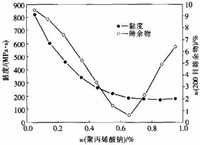 图2 聚丙烯酸钠的加入量对泥浆黏度和筛余物的影响